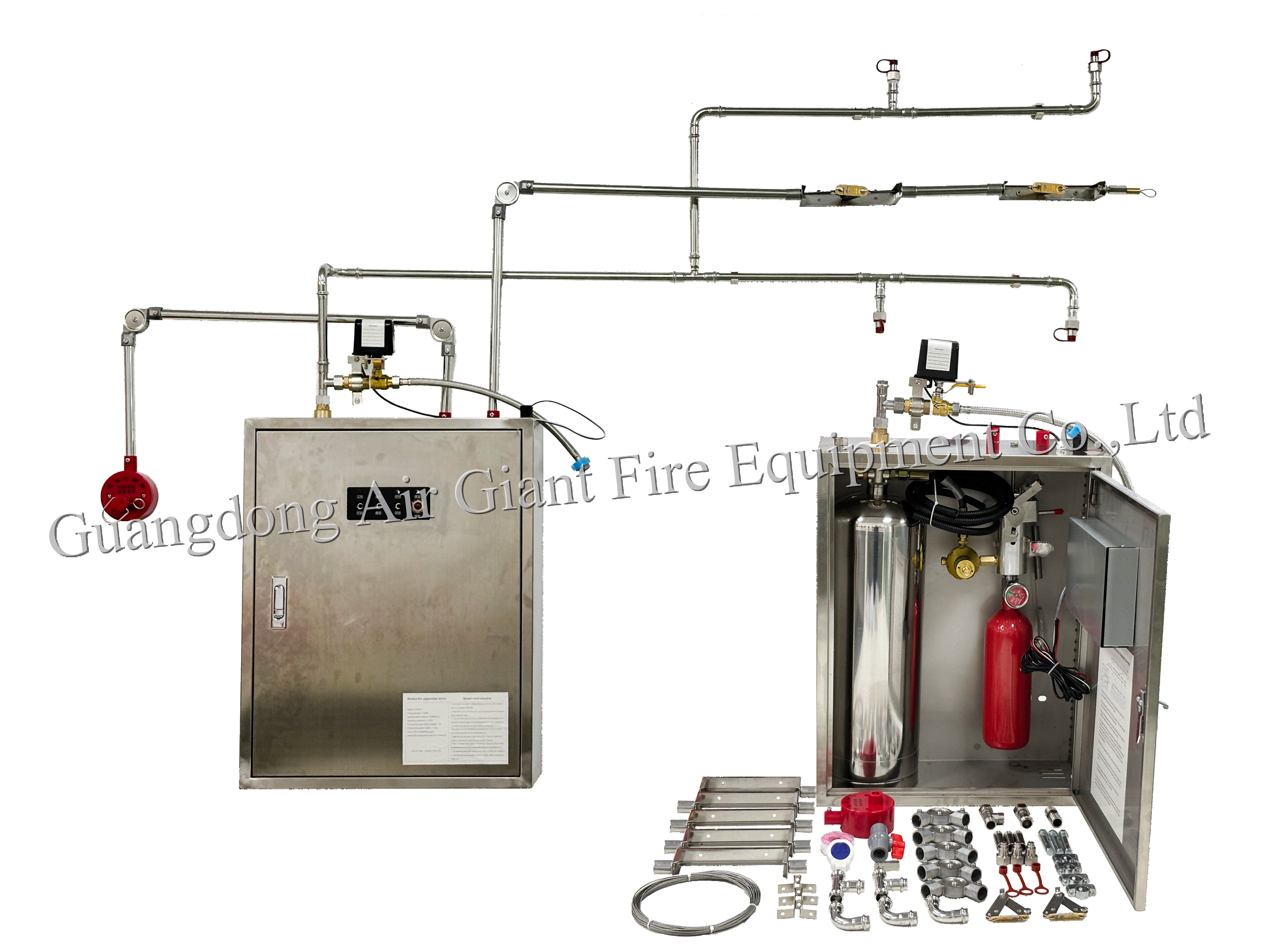 L'apparecchio estintore per apparecchiature da cucina è un insieme completo di dispositivi installati in ambienti ad alta umidità e calore, quali cucine industriali, cucine commerciali e cucine civili.compresi: