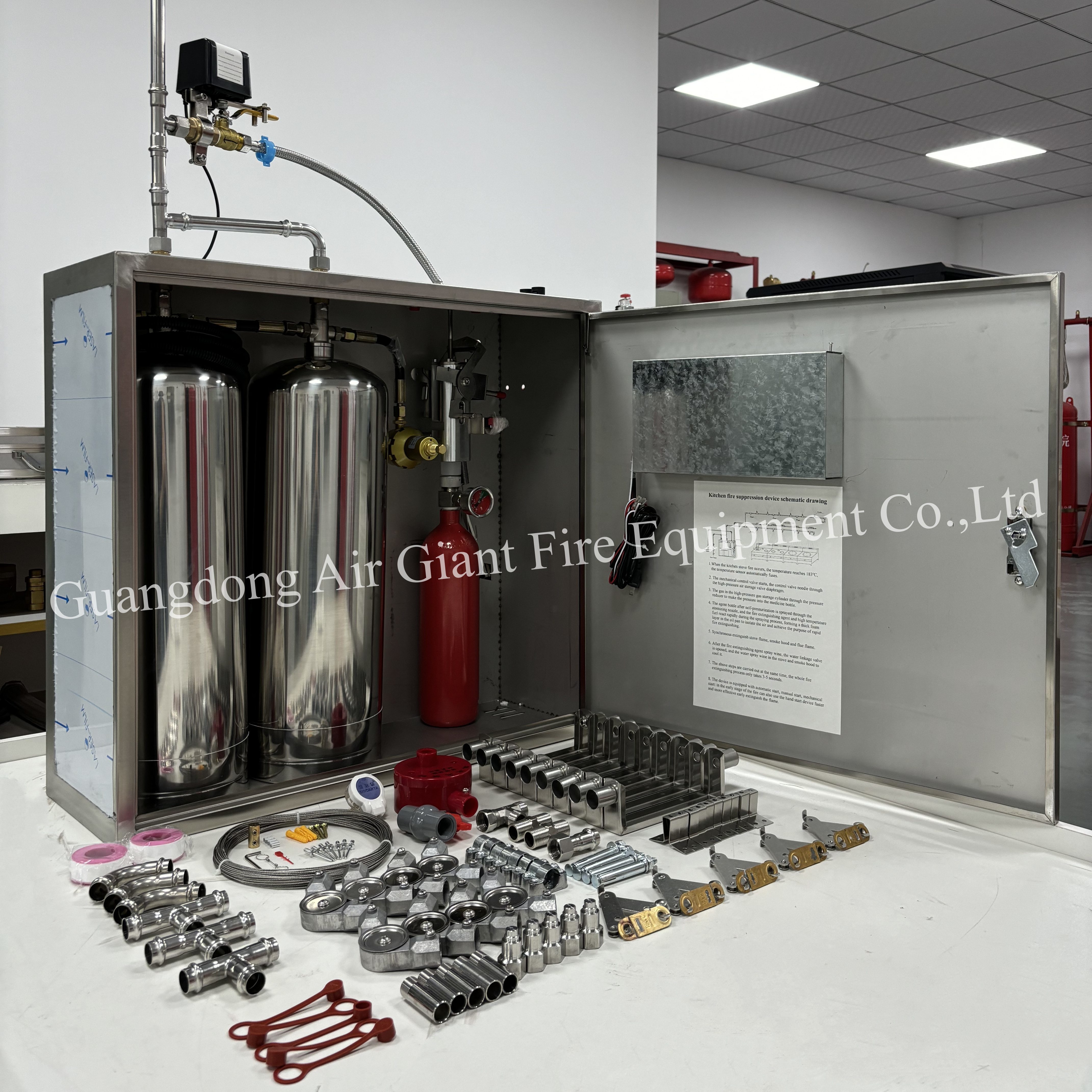L'attrezzatura da cucina è un estintoreun insieme completo di dispositivi installati in ambienti ad alta umidità e calore quali cucine industriali, cucine commerciali e cucine civili, compresi: